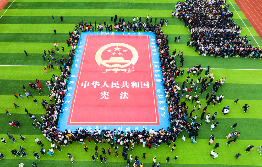 12月4日,重慶市云陽縣人民法院聯(lián)合南溪中學青少年法治教育基地等單位共同舉辦“知憲法于心,守法律于行”活動,3200多名在校師生參加憲法宣誓儀式。圖為法院干警與千名師生簇擁憲法簽名。