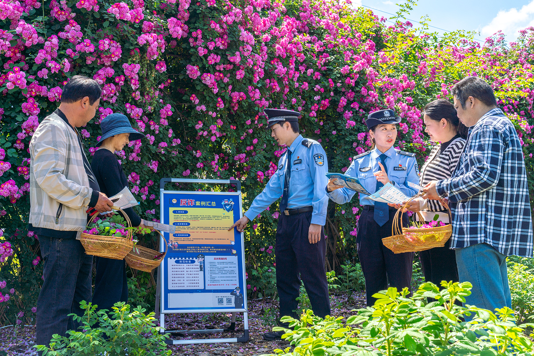 近日,上海市公安局崇明分局綠華派出所民警來到轄區(qū)農(nóng)莊,向正在采摘花瓣的員工們開展電信網(wǎng)絡(luò)詐騙防范宣傳。