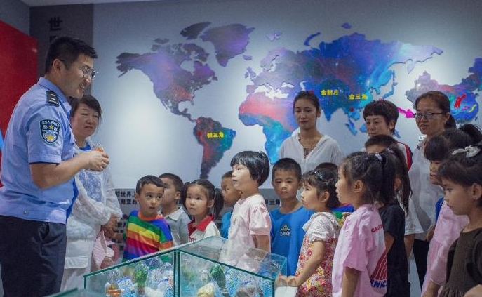 近日,新疆伊犁邊境管理支隊可克達(dá)拉邊境派出所在轄區(qū)禁毒教育基地,運用VR體驗、全息成像、人工智能等高科技手段,為轄區(qū)幼兒園的小朋友們上了一堂生動的禁毒宣傳教育課。圖為民警為孩子們介紹毒品的危害性。