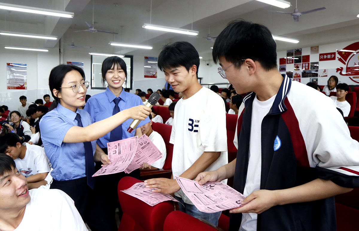 河南省汝陽縣人民檢察院近日組織干警到縣中等專業(yè)學校開展“無毒青春 健康生活”活動,切實提高大家識毒、防毒、拒毒意識與能力,保障校園良好學習、生活環(huán)境。圖為干警與學生開展禁毒知識問答互動活動。