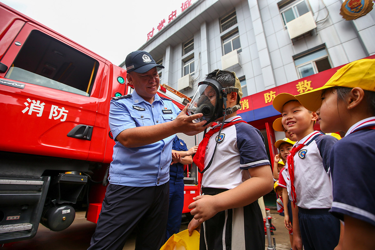 7月16日,山東省濟南市公安局市中分局六里山派出所聯(lián)合玉函北社區(qū),組織玉函小學學生走進英雄山路消防救援站開展暑假研學活動。圖為民警指導學生體驗消防裝備。