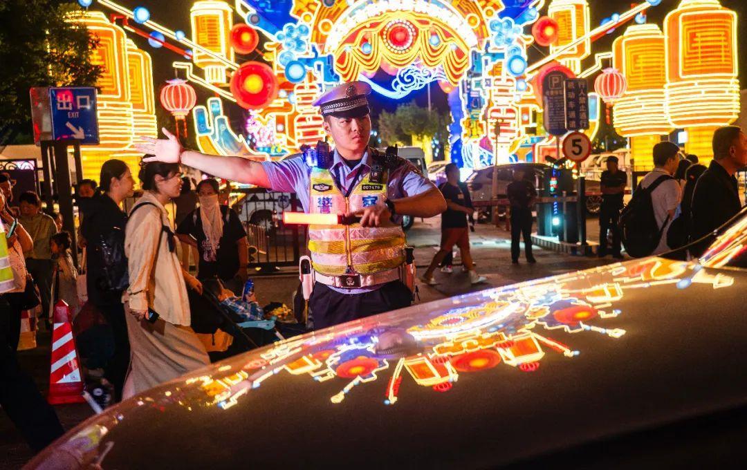 “京彩燈會(huì)”近日在北京園博園正式啟幕,約4萬(wàn)名游客暢游燈海。針對(duì)人流量大等情況,北京豐臺(tái)警方在燈會(huì)9個(gè)區(qū)域按不同等級(jí)梯次投入安保警力,全力為燈會(huì)保駕護(hù)航。圖為交警在燈會(huì)周邊疏導(dǎo)交通。