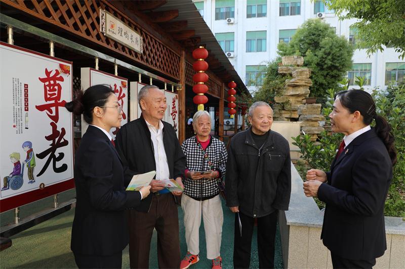 10月11日重陽節(jié),江蘇省靖江市人民檢察院干警走進養(yǎng)老服務機構,開展食品安全專項整改回頭看行動,并為老人們帶去節(jié)日的祝福。圖為檢察干警與老年人交流。