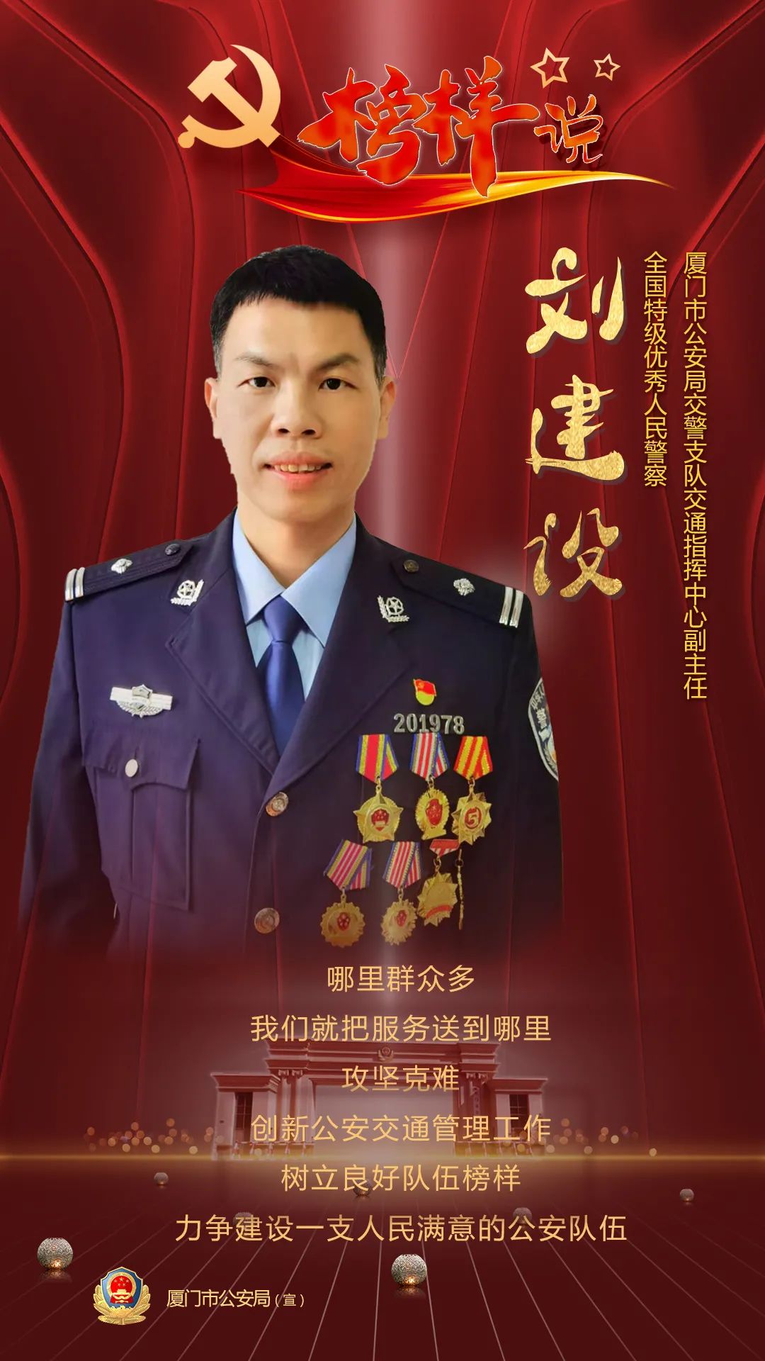 劉建設(shè) 40歲,漢族,中共黨員,廈門(mén)大學(xué)計(jì)算機(jī)系畢業(yè),碩士研究生學(xué)位,2003年12月入警,現(xiàn)任廈門(mén)市公安局交警支隊(duì)交通科研設(shè)施大隊(duì)教導(dǎo)員。先后榮獲“全國(guó)特級(jí)優(yōu)秀人民警察”“公安部基層技術(shù)革新二等獎(jiǎng)”“中國(guó)好交警”“福建省五一勞動(dòng)獎(jiǎng)?wù)隆薄案=ㄊ∠冗M(jìn)工作者”廈門(mén)市“我最喜愛(ài)的十佳民警”等多項(xiàng)榮譽(yù)和獎(jiǎng)項(xiàng),榮立個(gè)人二等功1次、個(gè)人三等功2次。