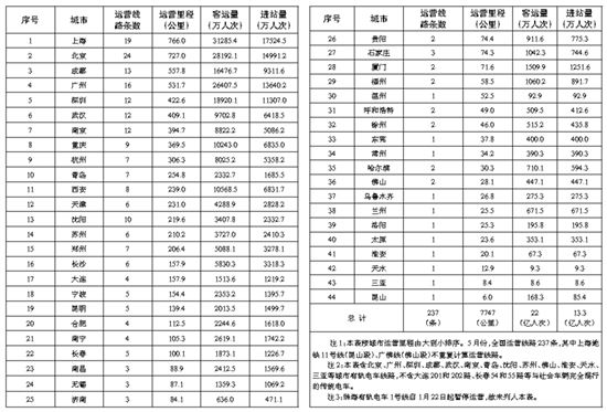 5月,全國(不含港澳臺,下同)共有45個城市開通運營城市軌道交通線路237條,運營里程7747公里,實際開行列車263萬列次,完成客運量22億人次,進(jìn)站量13.3億人次,未發(fā)生較大以上運營安全責(zé)任事故。