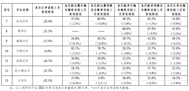 一、在訂單量超過30萬單的網(wǎng)約車平臺中,訂單合規(guī)率最高的是如祺出行,最低的是方舟行。2021年6月訂單量超過30萬單的網(wǎng)約車平臺共13家。與5月份相比,招招出行、東風出行從5月訂單量超過30萬單降到30萬單以下。按訂單合規(guī)率(指駕駛員和車輛均獲得許可的訂單量占比)從高到低的分別是如祺出行、享道出行、T3出行、神州專車、陽光出行、曹操出行、首汽約車、幫邦行、滴滴出行、萬順叫車、美團打車、花小豬出行、方舟行。本月訂單合規(guī)率增長排名前3名的分別是如祺出行、方舟行、花小豬出行;下降最多的分別是曹操出行、享道出行、美團打車。