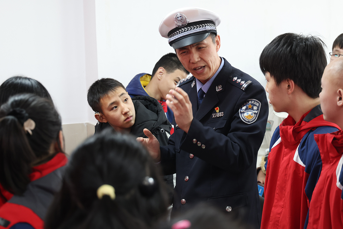 3月20日,遼寧省沈陽市公安局交通警察局大東大隊民警在聾啞學(xué)校用手語講解交通安全知識,并與同學(xué)們互動交流。