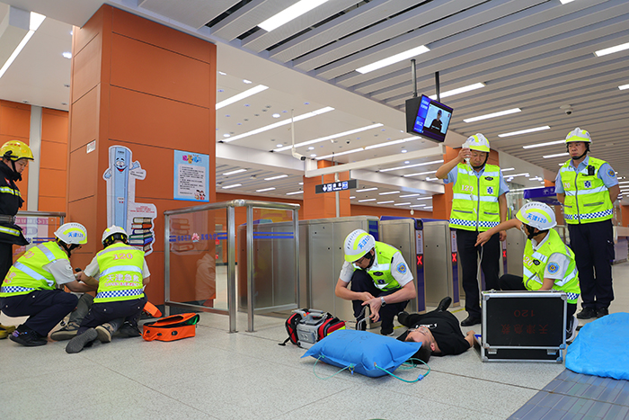 演練現(xiàn)場,模擬末端列車駕駛員室因電氣設(shè)備短路引發(fā)火情,使得列車迫停于區(qū)間,大量乘客受困于車廂內(nèi),同時因無法動車影響其他列車運行,導致學苑北路站客流積壓的事件場景。演練過程組織嚴密、緊張有序,火災(zāi)警報觸發(fā)后,地鐵運營工作人員快速到達受困車廂安撫“乘客”并就近實施疏散,在引導“乘客”逃生的同時時刻關(guān)注“乘客”身體狀況,及時開展救助救援和急救措施。車站內(nèi)軌道運營企業(yè)先期處置、區(qū)級應(yīng)急力量參與、市指揮部指揮跨區(qū)應(yīng)急聯(lián)動,車站外市消防救援總隊、市衛(wèi)健委等市指揮部成員單位和區(qū)指揮部成員單位之間協(xié)同配合聯(lián)動處置,各級預案逐步啟動,各單位、部門及時響應(yīng),對預設(shè)場景應(yīng)急處置快速得當。