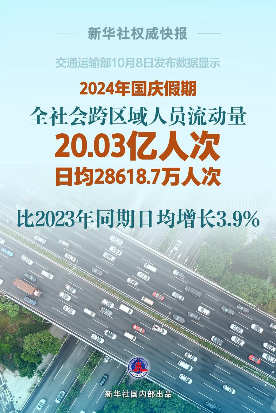 全社會(huì)跨區(qū)域人員流動(dòng)量20.03億人次,日均28618.7萬人次,比2023年同期日均增長(zhǎng)3.9%