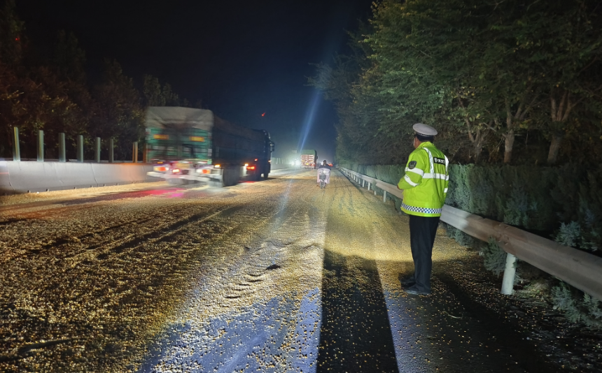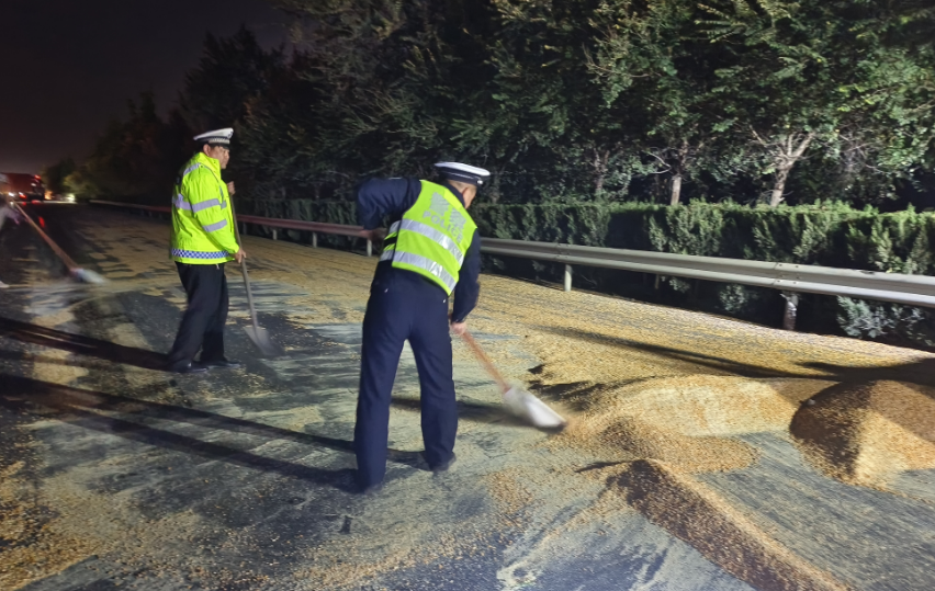 2024年11月4日晚,河南省鶴壁市淇縣交警大隊(duì)高村中隊(duì)況宏民班組在107國(guó)道巡邏時(shí),忽然聽(tīng)到有人呼喊:“不好!誰(shuí)的玉米灑了。”
