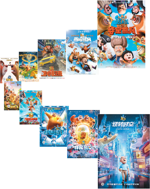 圖①:《熊出沒之奪寶熊兵》(2014)圖②:《熊出沒之雪嶺熊風》(2015)圖③:《熊出沒之熊心歸來》(2016)圖④:《熊出沒·奇幻空間》(2017)圖⑤:《熊出沒·變形記》(2018)圖⑥:《熊出沒·原始時代》(2019)圖⑦:《熊出沒·狂野大陸》(2021)圖⑧:《熊出沒·重返地球》(2022)圖⑨:《熊出沒·伴我“熊芯”》(2023)圖⑩:《熊出沒·逆轉時空》(2024)