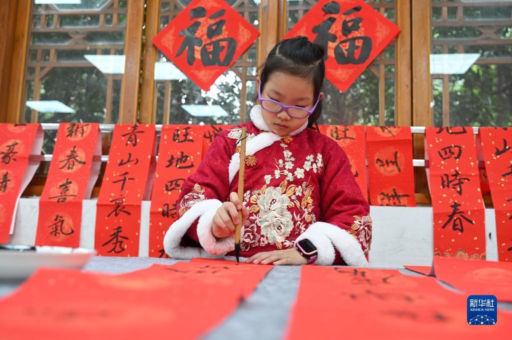 1月12日,在四川省內(nèi)江市東興區(qū)東興老街,一名小朋友在寫春聯(lián)。新華社發(fā)(唐明潤(rùn)攝)