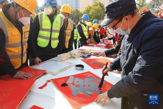 春節(jié)臨近,多地組織書法志愿者走進社區(qū)、工地等場所,為人們書寫春聯(lián)和福字,迎接春節(jié)的到來。
