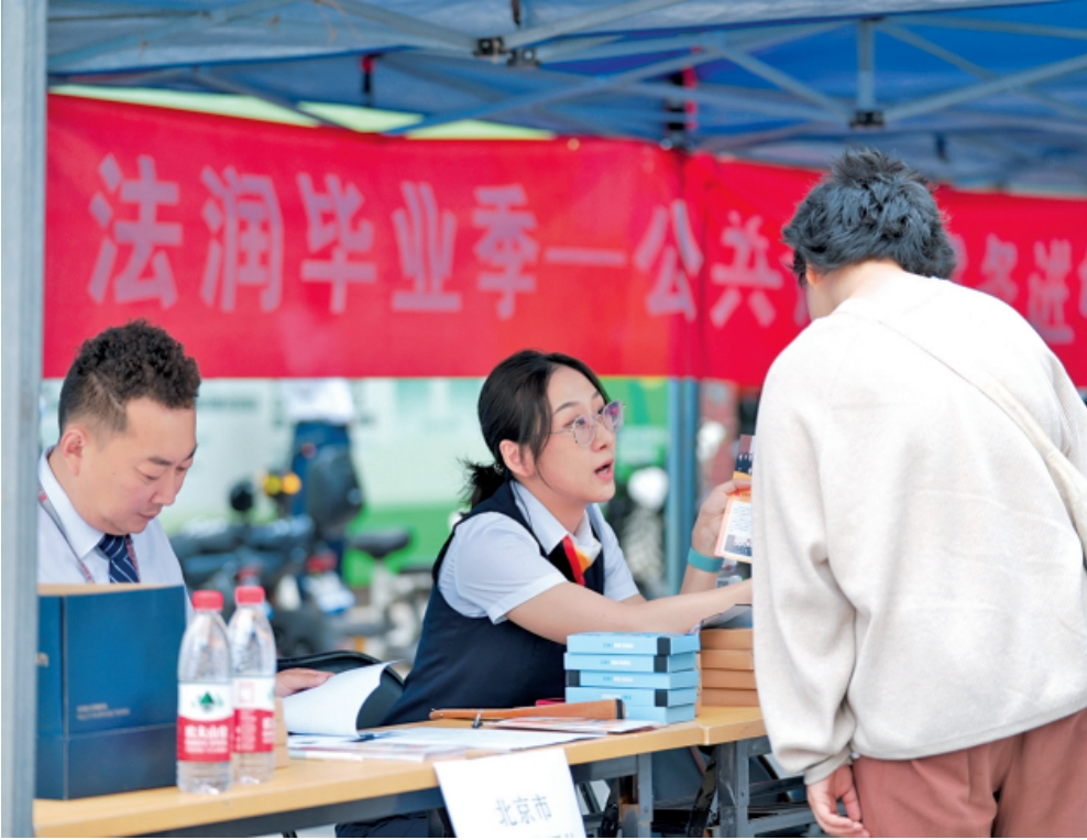 六月五日,在北京市司法局與首都師范大學(xué)聯(lián)合舉辦的“法潤畢業(yè)季”活動(dòng)中,公證處工作人員在校內(nèi)設(shè)立流動(dòng)公證服務(wù)點(diǎn),為有需求的同學(xué)提供便捷的公證指引。據(jù)悉,只要當(dāng)事人的材料齊全,符合受理?xiàng)l件及出證條件,跑一次就可以辦好公證書。 (北京市司法局供圖)