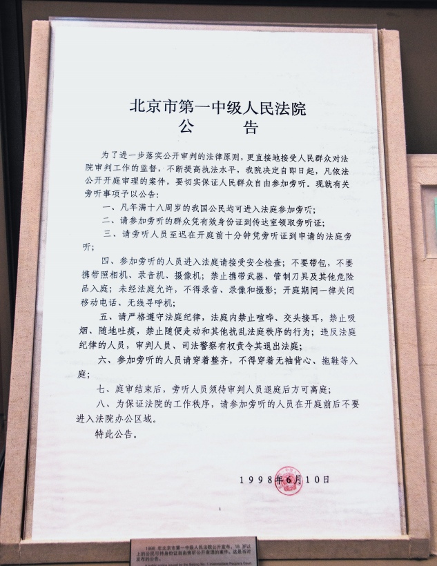 1998年6月,北京市第一中級(jí)人民法院公開宣布,18歲以上的公民可持身份證自由旁聽公開審理的案件。圖為當(dāng)時(shí)發(fā)布的公告。視覺中國供圖