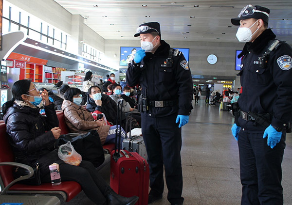 錢一鳴帶領(lǐng)民警在候車廳巡視,提示旅客做好個(gè)人防護(hù)。徐偉倫 攝