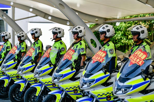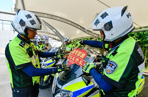 6月6日,山東省棗莊市臺(tái)兒莊公安分局交警大隊(duì)民警在車輛上粘貼愛(ài)心送考標(biāo)識(shí)。今年高考期間,山東省棗莊市臺(tái)兒莊公安分局交警大隊(duì)組織了14輛“愛(ài)心送考車”在高考考點(diǎn)疏導(dǎo)交通,處理突發(fā)事件,為考生愛(ài)心護(hù)考。