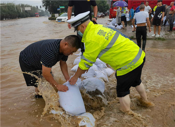 圖為湖北襄陽民警正在與群眾一起用沙袋筑壩擋水。