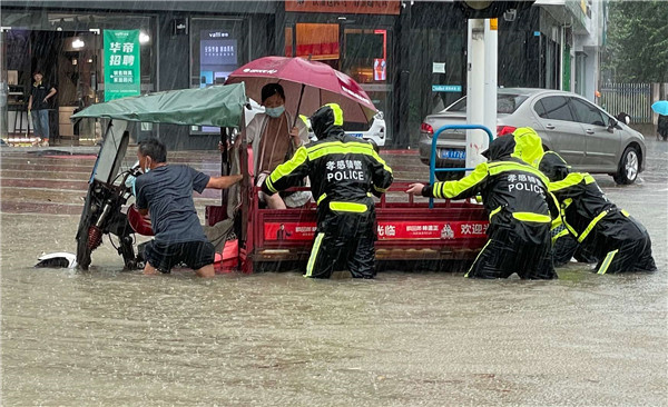 8月12日,孝感城區(qū)多條道路積水嚴重。孝感公安交警立即轉為“多功能服務隊”,開展路面巡控、疏導和救援。