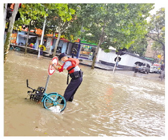 圖為民警在汝河路與文化宮路交叉口積水處設(shè)置警示標(biāo)志。