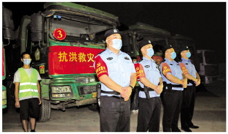 圖為8月21日夜,民警在金田路與富民路口的積水點(diǎn)嚴(yán)陣以待。