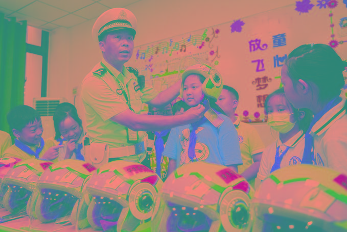 圖②:9月1日,湖北宜昌交警指導學生佩戴安全頭盔。許俊富 攝