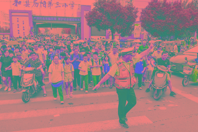 圖①:9月1日,安徽省和縣公安局交警大隊輔警護送學生過馬路。秦祖泉 攝