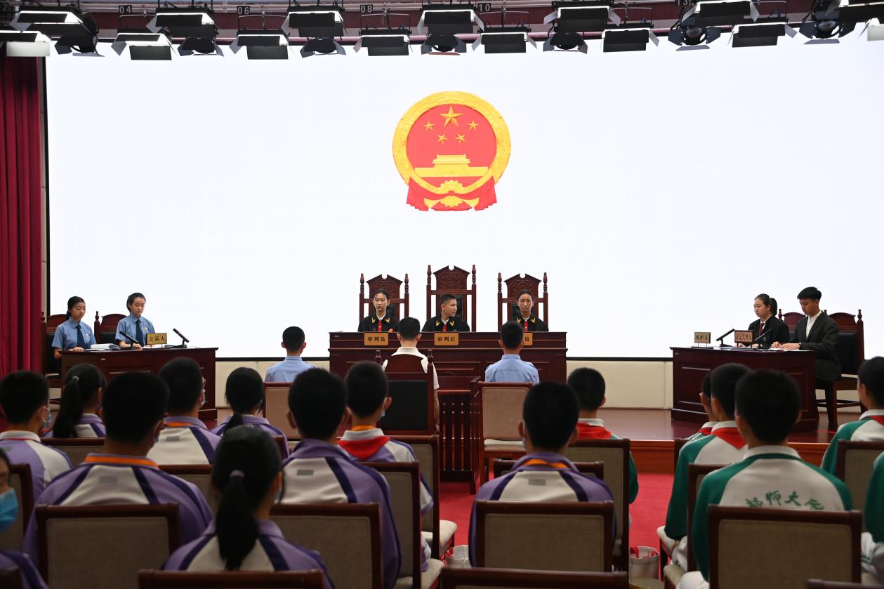 開放日活動(dòng)的最后一個(gè)環(huán)節(jié)是設(shè)立小型模擬法庭,互動(dòng)式體驗(yàn)法治教育。在模擬法庭中,首都師范大學(xué)附屬中學(xué)的學(xué)生周詳森和孫鈺桐分別擔(dān)任審判長(zhǎng)和公訴人,他們穿上制服,走進(jìn)法庭,有條不紊、嚴(yán)謹(jǐn)規(guī)范地開啟了“沉浸式”體驗(yàn)。