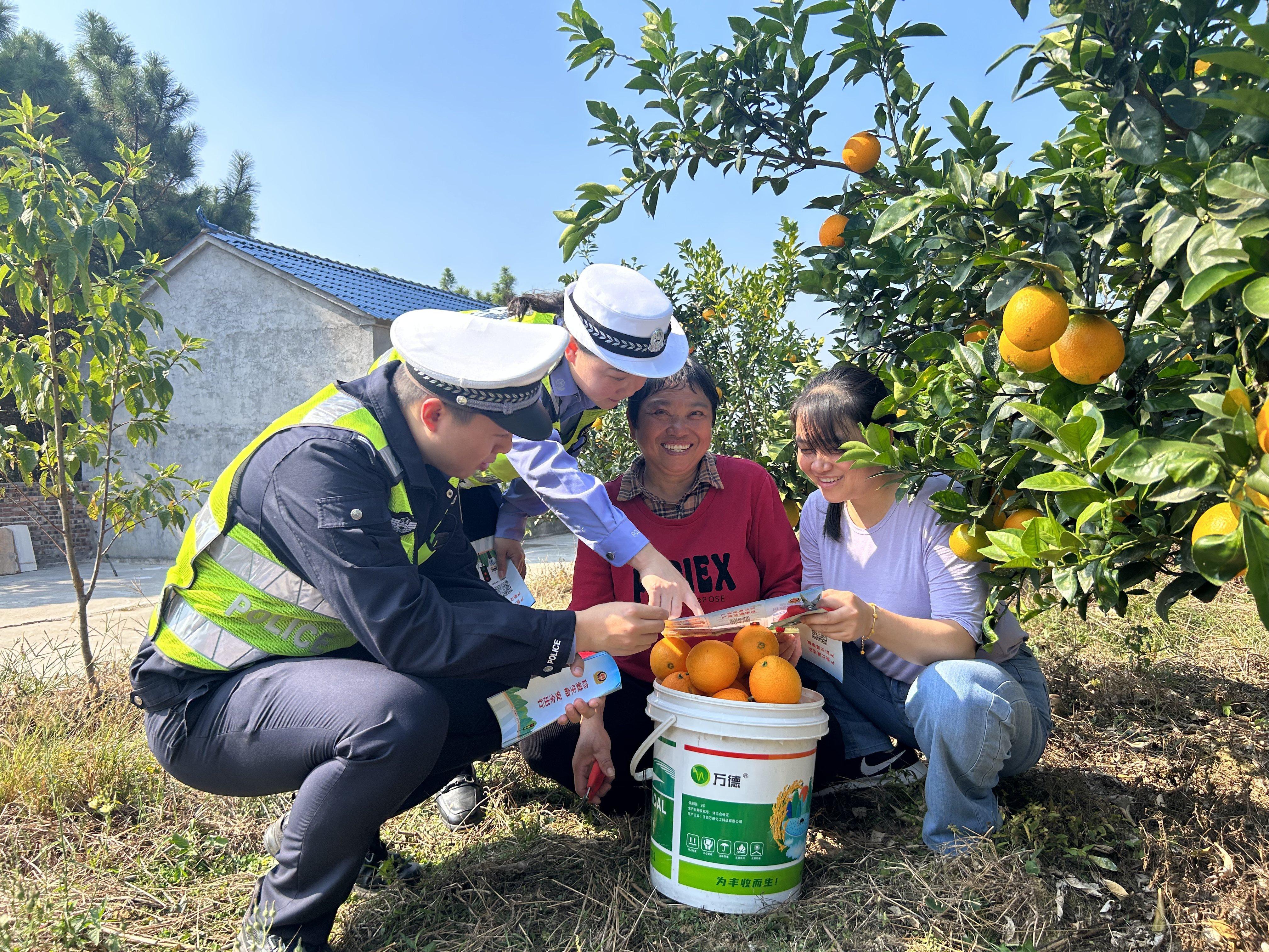 入冬以來,江西省吉安市吉水縣公安局交警大隊組織民警走進阜田鎮(zhèn)各大果園與果農(nóng)嘮家常、聊豐收、話安全,開展全“橙”護航交通安全宣傳活動。