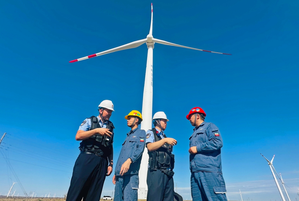 圖為派出所民警與企業(yè)安全員在風(fēng)電廠區(qū)開(kāi)展聯(lián)合安全檢查。
