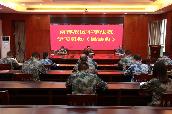 南部戰(zhàn)區(qū)軍事法院召開專題黨委會,認(rèn)真學(xué)習(xí)習(xí)近平主席在中央政治局第二十次集體學(xué)習(xí)時(shí)的重要講話、全國法院學(xué)習(xí)貫徹2020年全國兩會精神視頻會議精神和民法典,專題部署推動戰(zhàn)區(qū)兩級軍事法院和轄區(qū)部隊(duì)民法典學(xué)習(xí)宣傳貫徹工作,要求戰(zhàn)區(qū)兩級軍事法院在學(xué)習(xí)宣傳貫徹民法典中走在前列,為部隊(duì)和官兵樹好標(biāo)桿;準(zhǔn)確理解和把握民法典立法精神、條文含義和最新內(nèi)容,提高運(yùn)用民法典維護(hù)官兵權(quán)益、化解矛盾糾紛、促進(jìn)部隊(duì)和社會和諧穩(wěn)定的能力;把深入宣傳貫徹民法典作為當(dāng)前和今后一個(gè)時(shí)期的工作重點(diǎn),在戰(zhàn)區(qū)部隊(duì)營造尊法學(xué)法守法用法的濃厚氛圍。