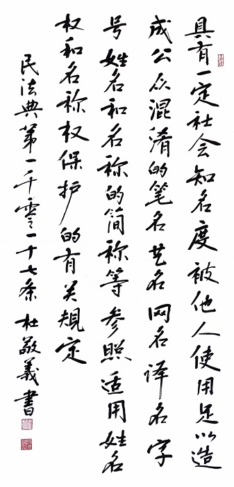 民法典第一千零一十七條 具有一定社會(huì)知名度,被他人使用足以造成公眾混淆的筆名、藝名、網(wǎng)名、譯名、字號(hào)、姓名和名稱的簡(jiǎn)稱等,參照適用姓名權(quán)和名稱權(quán)保護(hù)的有關(guān)規(guī)定。