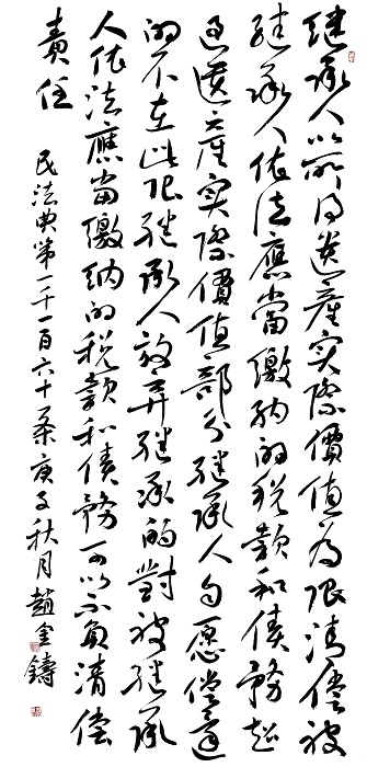 趙金鑄,中國(guó)書法家協(xié)會(huì)會(huì)員,中國(guó)檢察官文聯(lián)書畫協(xié)會(huì)理事,甘肅省定西市渭源縣人民檢察院黨組書記、檢察長(zhǎng),甘肅省書法家協(xié)會(huì)草書委員會(huì)委員,定西市書法家協(xié)會(huì)副主席,定西檢察官文聯(lián)副主席兼書法家協(xié)會(huì)主席。