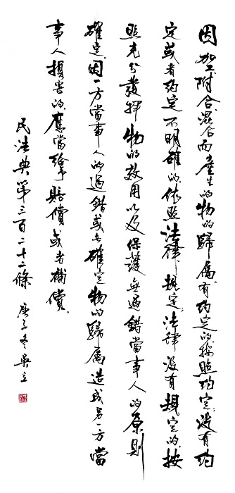 民法典第三百二十二條 因加工、附合、混合而產(chǎn)生的物的歸屬,有約定的,按照約定;沒有約定或者約定不明確的,依照法律規(guī)定;法律沒有規(guī)定的,按照充分發(fā)揮物的效用以及保護無過錯當事人的原則確定。因一方當事人的過錯或者確定物的歸屬造成另一方當事人損害的,應當給予賠償或者補償。