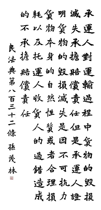 民法典第八百三十二條 承運人對運輸過程中貨物的毀損、滅失承擔賠償責任。但是,承運人證明貨物的毀損、滅失是因不可抗力、貨物本身的自然性質或者合理損耗以及托運人、收貨人的過錯造成的,不承擔賠償責任。