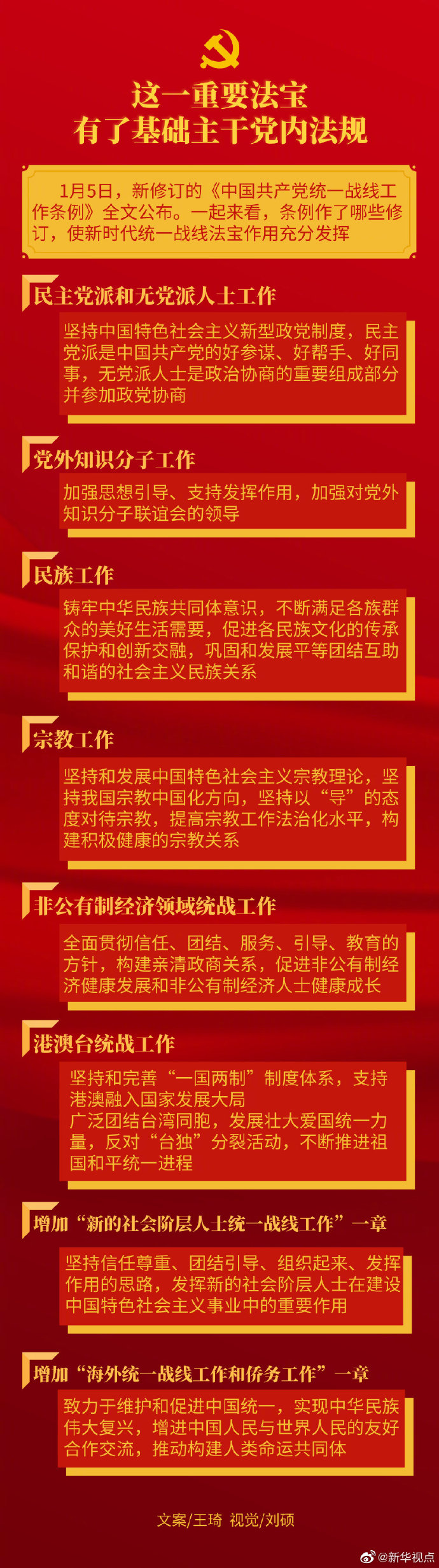 統(tǒng)一戰(zhàn)線是黨的事業(yè)取得勝利的重要法寶。1月5日,新修訂的《中國共產(chǎn)黨統(tǒng)一戰(zhàn)線工作條例》全文公布。條例作了哪些修訂,使新時代統(tǒng)一戰(zhàn)線法寶作用充分發(fā)揮,為全面建設社會主義現(xiàn)代化國家、實現(xiàn)中華民族偉大復興的中國夢凝心聚力,一起來看↓