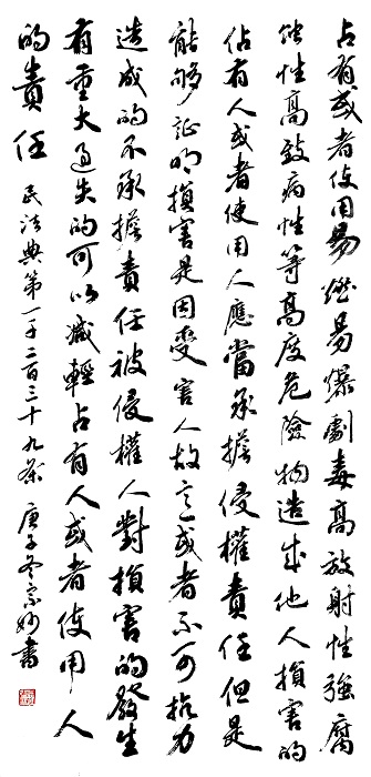 民法典第一千二百三十九條 占有或者使用易燃、易爆、劇毒、高放射性、強(qiáng)腐蝕性、高致病性等高度危險(xiǎn)物造成他人損害的,占有人或者使用人應(yīng)當(dāng)承擔(dān)侵權(quán)責(zé)任;但是,能夠證明損害是因受害人故意或者不可抗力造成的,不承擔(dān)責(zé)任。被侵權(quán)人對損害的發(fā)生有重大過失的,可以減輕占有人或者使用人的責(zé)任。