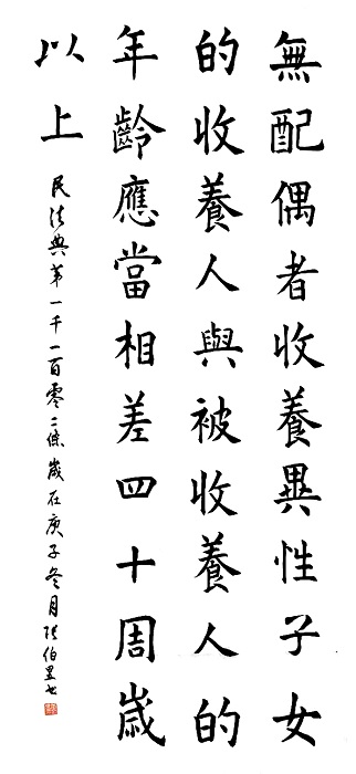 民法典第一千一百零二條 無配偶者收養(yǎng)異性子女的,收養(yǎng)人與被收養(yǎng)人的年齡應當相差四十周歲以上。