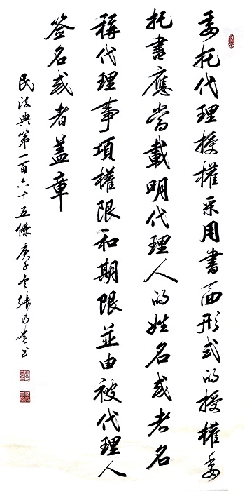民法典第一百六十五條 委托代理授權采用書面形式的,授權委托書應當載明代理人的姓名或者名稱、代理事項、權限和期限,并由被代理人簽名或者蓋章。