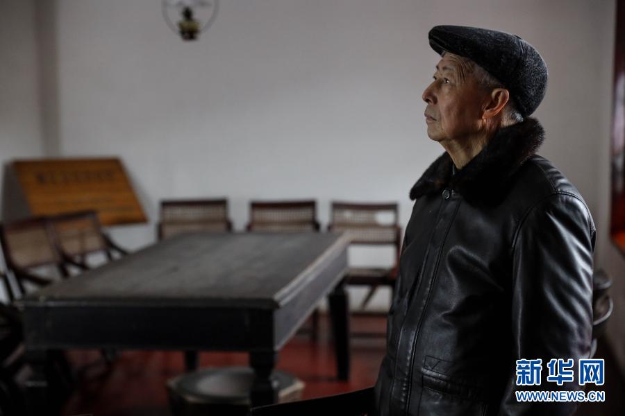 1月27日,83歲的遵義會議紀(jì)念館原副館長田興詠在遵義會議召開的長方桌前口述歷史。新華社記者 歐東衢 攝