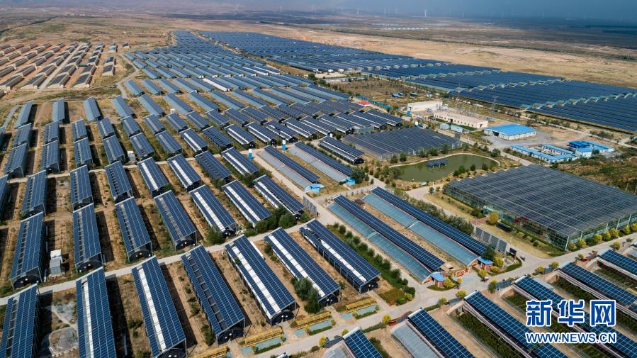俯瞰寧夏銀川市永寧縣閩寧鎮(zhèn)原隆村的光伏大棚(無人機照片,2019年9月3日攝)。新華社記者 王鵬 攝