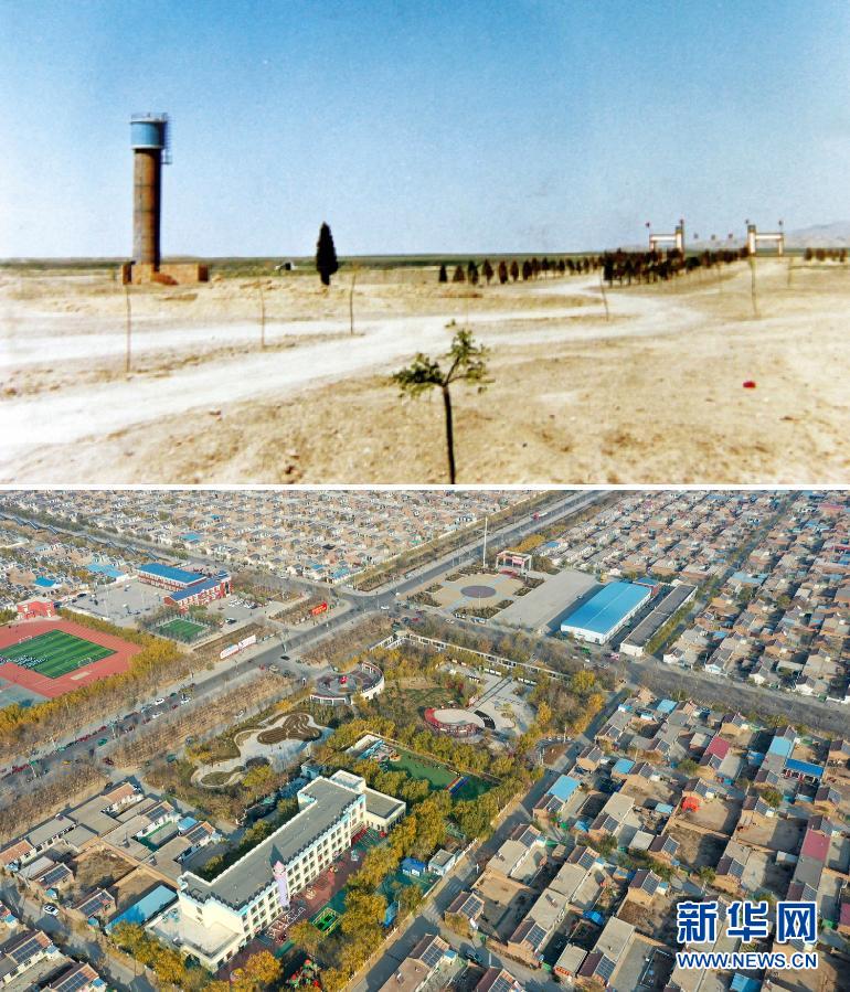 這是一張拼版照片。上圖為寧夏銀川市永寧縣閩寧鎮(zhèn)建設(shè)初期景象(資料照片);下圖為2020年11月11日拍攝的寧夏銀川市永寧縣閩寧鎮(zhèn)原隆村(無人機照片,新華社記者馮開華攝)。新華社發(fā)