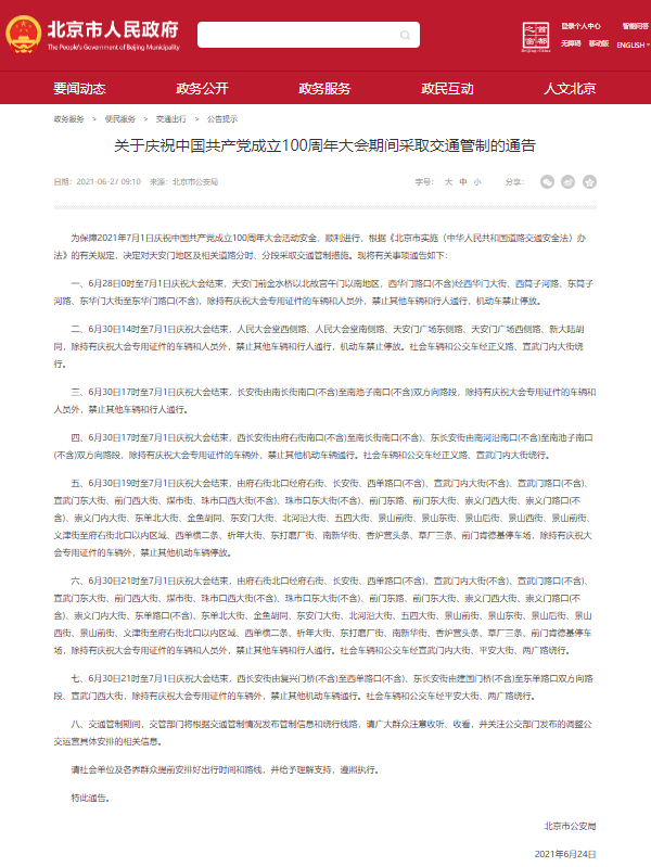 原標(biāo)題:關(guān)于慶祝中國共產(chǎn)黨成立100周年大會期間采取交通管制的通告