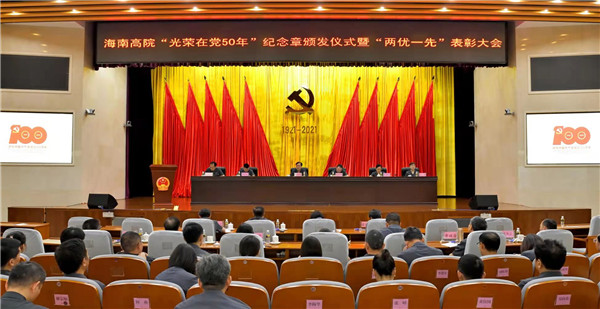 6月30日上午,海南省高院隆重召開“光榮在黨50年”紀(jì)念章頒發(fā)儀式暨“兩優(yōu)一先”表彰大會。省高院黨組書記、院長陳鳳超出席會議并講話。