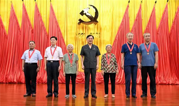 會場內(nèi),紅旗漫卷,紅色紀(jì)念章閃耀奪目的光芒。頒授儀式在莊嚴(yán)的國歌聲中正式開始。當(dāng)榮獲“光榮在黨50年”紀(jì)念章的老黨員代表們步入會場時(shí),會場響起熱烈的掌聲。