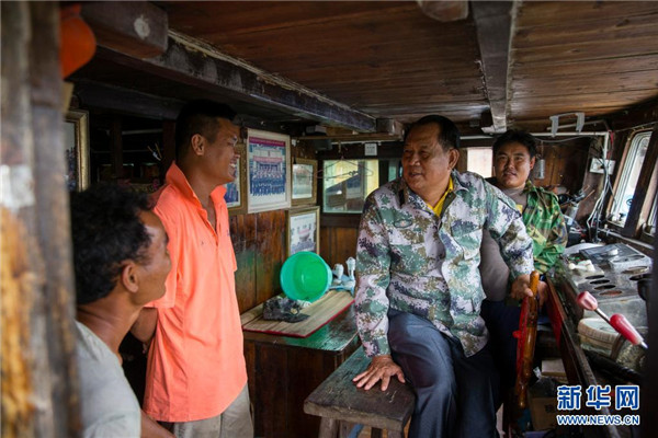 在海南省瓊海市潭門港的漁船上,王書茂(右二)與漁民交流(2018年11月14日攝)。新華社發(fā)(宋國強 攝)