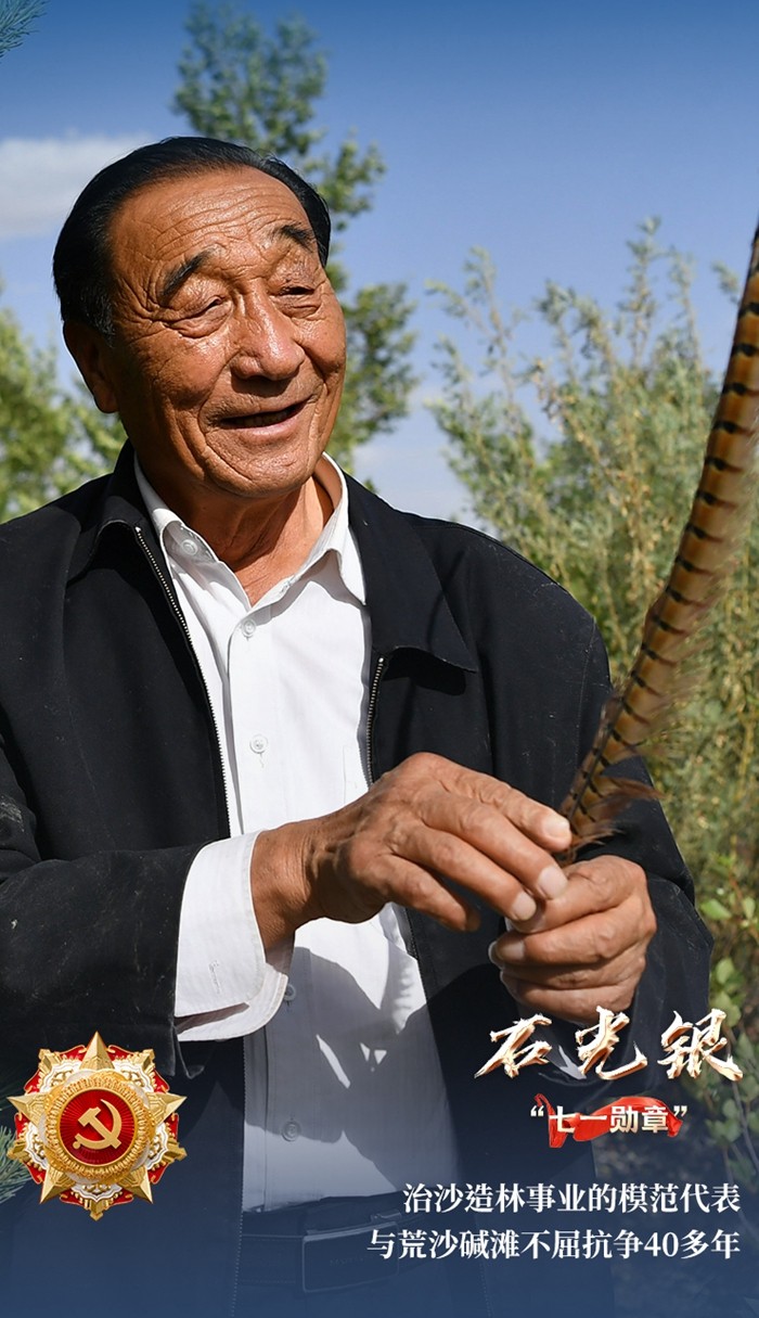 “石光銀,治沙造林事業(yè)的模范代表,40多年堅(jiān)持與荒沙堿灘不屈抗?fàn)?,?chuàng)造治沙與致富相結(jié)合的新模式,為徹底改變毛烏素沙漠南緣‘沙進(jìn)人退’惡劣環(huán)境作出杰出貢獻(xiàn)。”這簡(jiǎn)短的出場(chǎng)介紹,讓更多的人記住了這副寬厚的肩膀扛起來(lái)的不凡事業(yè),也為“治沙人”的故事寫(xiě)下梗概。