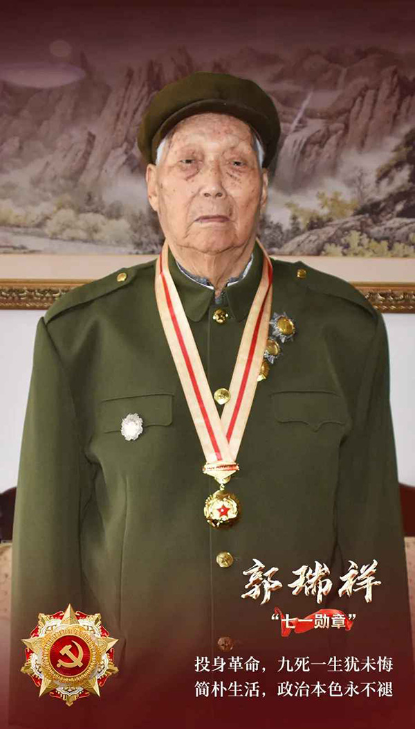中國共產黨百年光輝歷程,郭瑞祥既是見證者又是參與者。作為軍人,他先后榮立二等功1次、三等功2次,1957年被授予三級獨立自由勛章、三級解放獎章,1988年被授予中國人民解放軍獨立功勛榮譽章。