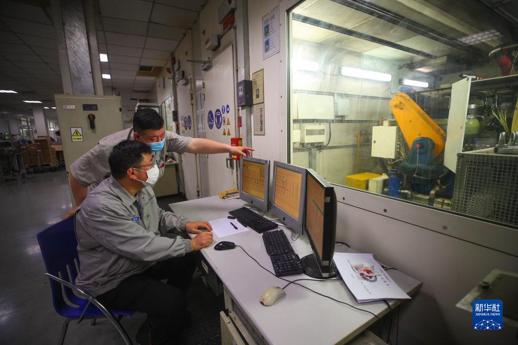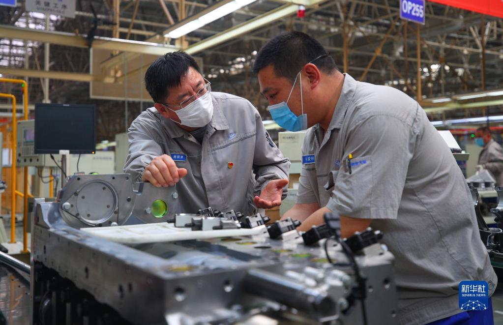 一汽解放大連柴油機(jī)有限公司的高級(jí)技師鹿新弟(左)在車(chē)間與同事交流(2020年5月7日攝)。新華社記者 龍雷 攝