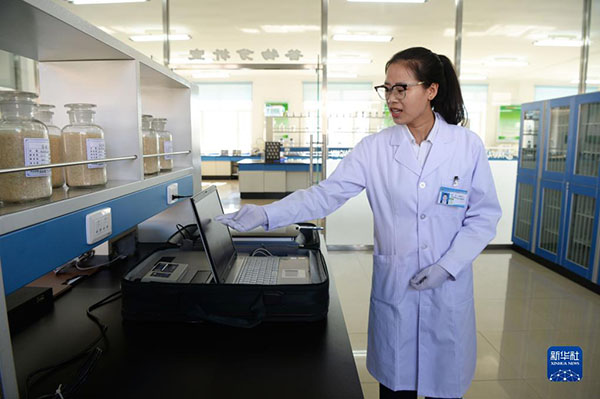 黑龍江北大荒建三江國(guó)家農(nóng)業(yè)科技園區(qū)工作人員裴鑫宇在做谷物品質(zhì)檢測(cè)(2018年9月27日攝)。新華社記者 王凱 攝